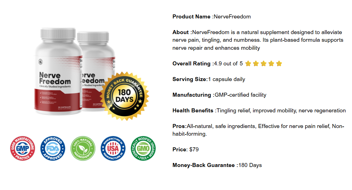 Nerve Freedom is a natural dietary supplement formulated to alleviate nerve discomfort and support long-term nerve health. NerveFreedom ⭐⭐⭐⭐⭐ (4.8/5 based on 11,200 reviews) In this review, we’ll explore its key benefits, look at the simple usage process that users rave about, and analyze customer feedback to see if it truly delivers the relief it promises.